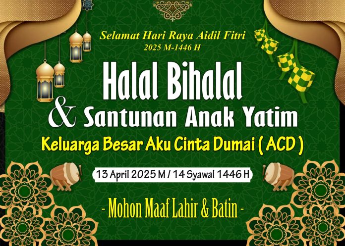 Sorotlensa.com, DUMAI – Gabungan Masyarakat yang menamai dirinya Aku Cinta Dumai (ACD) menggelar acara Halal Bihalal sembari menyantuni puluhan anak yatim. Ratusan warga Jalan Tegalega, Gang Darma Bhakti, Kelurahan Bukit Datuk, Kecamatan Dumai Selatan, dimana lokasi digelarnya acara tampak antusias antusias. Acara ini disponsori oleh salah seorang tokoh masyarakat yang dinilai dermawan di Kota Dumai yaitu H. Soeparto Wiguno.