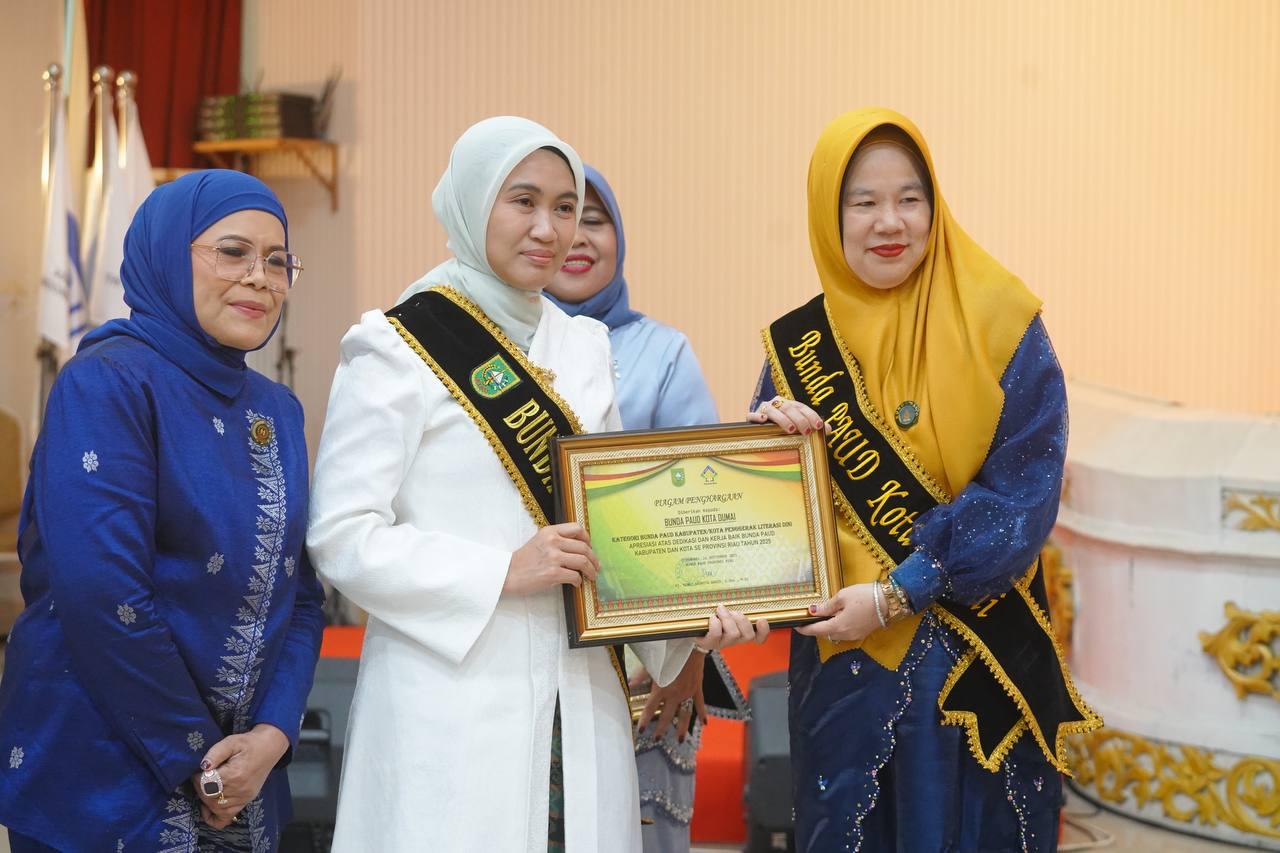 Ia menerima Piagam Penghargaan Kategori ‘Bunda PAUD Kabupaten/Kota Penggerak Literasi Dini’ pada acara Apresiasi Atas Dedikasi dan Kerja Baik Bunda PAUD Kabupaten dan Kota se-Provinsi Riau Tahun 2025.