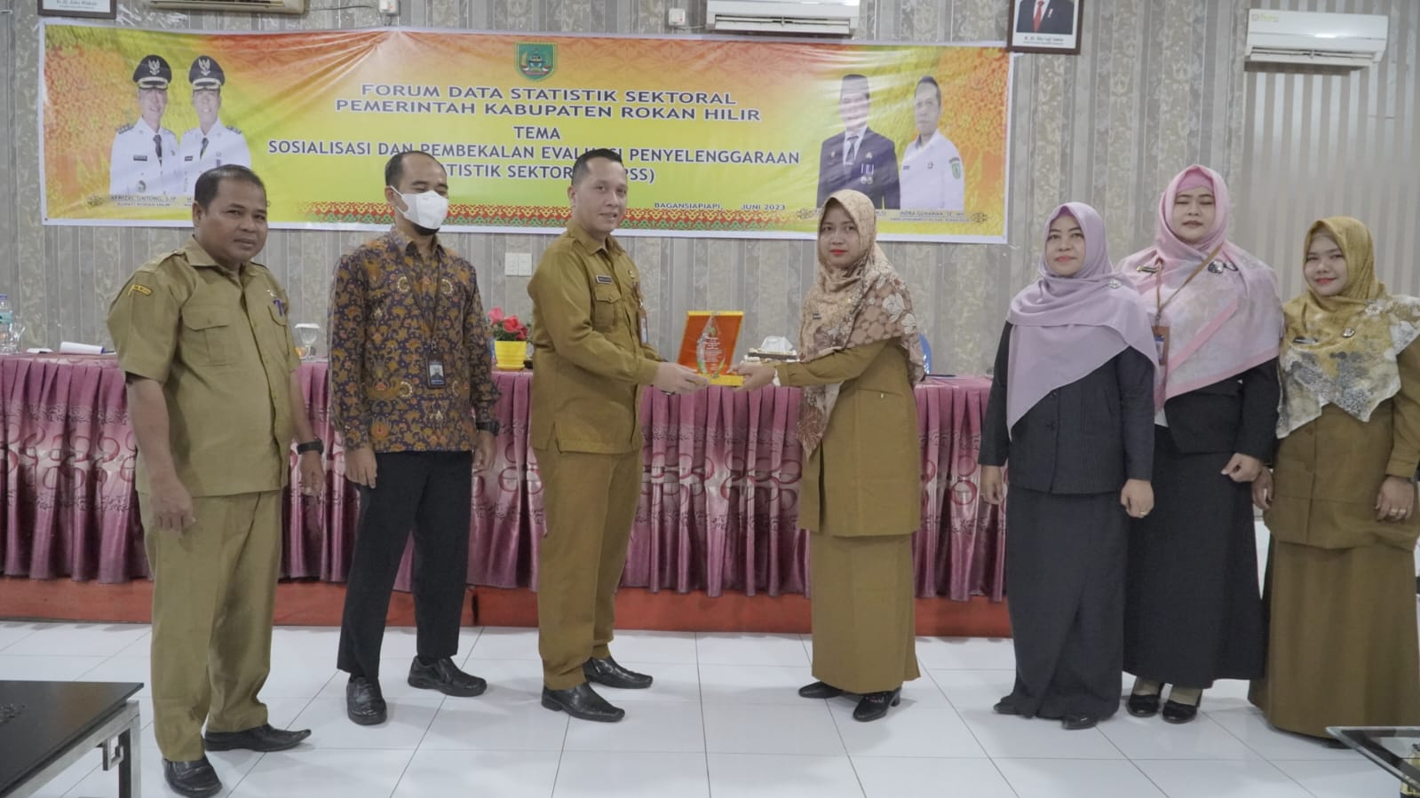 Hadir Kepala BPS Rokan Hilir, Ir. Rozalinda, ME, Statistisi Ahli Madya BPS Riau Emilia Dharmayanthi, S.ST, Msi dan Pranata Komputer Muda BPS Riau Dadang Sunandar, S.ST, MT, Kabid Perencanaan Perekonomian dan SDA Bappeda Rohil Ahmad Syukri, OPD dan Camat. dalam Arahannya Kadiskominfotiks Rohil Indra Gunawan, SE,.MH yang diwakili Kabid Statistik Darmawati, SH.,MH menjelaskan bahwa dalam rangka memenuhi peraturan Presiden Nomor 39 Tahun 2019 tentang satu Data Indonesia (SDI), Peraturan Badan Pusat Statistik Nomor 3 Tahun 2022 tentang Evaluasi Penyelenggaraan Statistik Sektoral (EPPS) serta peraturan Bupati Nomor 120 Tahun 2021 tentang satu Data Kabupaten Rokan Hilir bahwa dinas Komunikas Informatika Statistik dan Persandian sebagai Walidata Statistik Sektoral ditingkat Kabupaten, kegiatan sosialisasi ini juga bertujuan untuk mengukur kemajuan penyelenggaraan statistik sektoral pemerintah daerah.