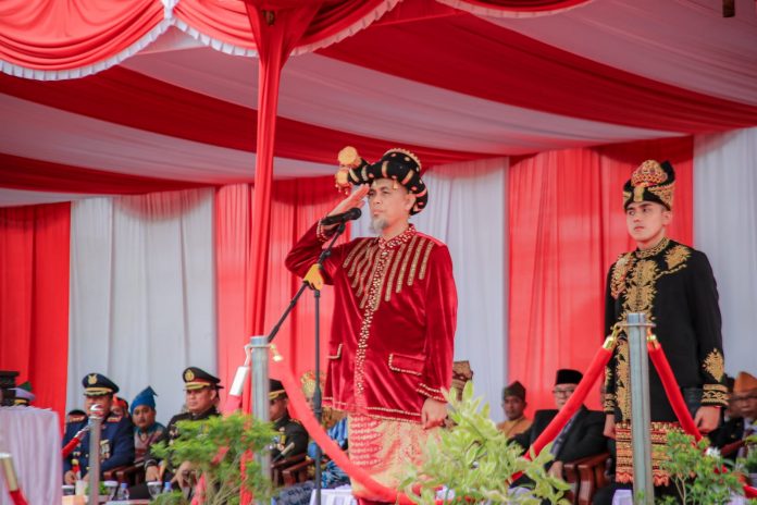 Sorotlensa.com, DUMAI – Gunakan pakaian tradisional Mandailing Natal (Madina) pada upacara Peringatan Hari Ulang Tahun Republik Indonesia (HUT RI) ke -78, Walikota Dumai Paisal SKM MARS bertindak sebagai Inspektur Upacara pada kamis(17/8) pagi.