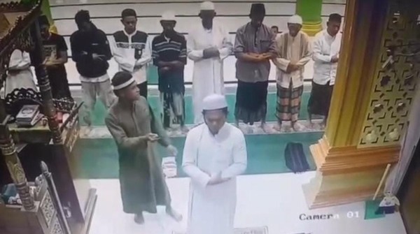 Penikaman itu terekam kamera CCTV masjid, tampak korban mengenakan jubah putih dan songkok putih memimpin salat dan beberapa jemaah di belakangnya.