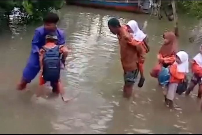 Anak-anak yang berangkat ke sekolah terpaksa digendong oleh orangtuanya. Kadang, orang dewasa yang sama-sama melintas menolong anak-anak sekolah menerobos banjir tersebut.