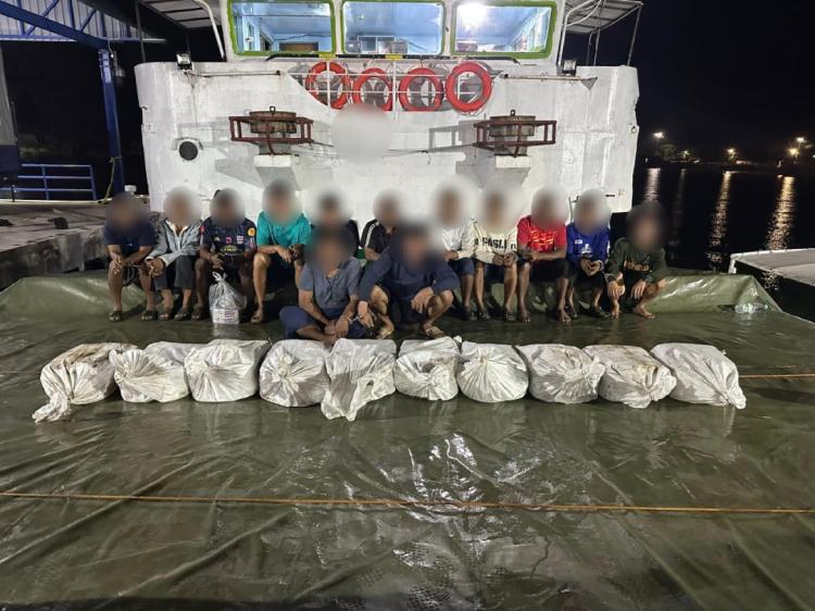 Sebanyak 13 awak kapal, terdiri dari 10 warga negara Thailand dan tiga warga negara Indonesia berusia antara 33 hingga 68 tahun, turut ditahan.