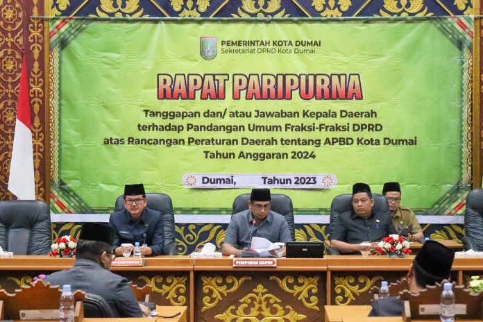 Sorotlensa.com, DUMAI – Dewan Perwakilan Rakyat Daerah (DPRD) Kota Dumai menggelar rapat paripurna tanggapan Walikota terhadap pandangan umum fraksi-fraksi atas Rancangan Peraturan Daerah (Ranperda) tentang APBD Kota Dumai Tahun Anggaran 2024. Salinan tanggapan Walikota dibacakan Sekretaris Daerah H. Indra Gunawan S.I.P, M.S.I dihadapan peserta diruang rapat paripurna gedung DPRD selasa(5/9).