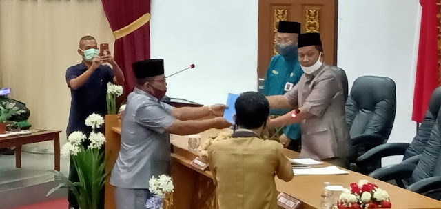 | Penyerahan berkas pandangan umum terhadap penjelasan Walikota Dumai dalam Ranperda 2019 oleh Marahamdan Harahap, Ketua Fraksi Demokrat |