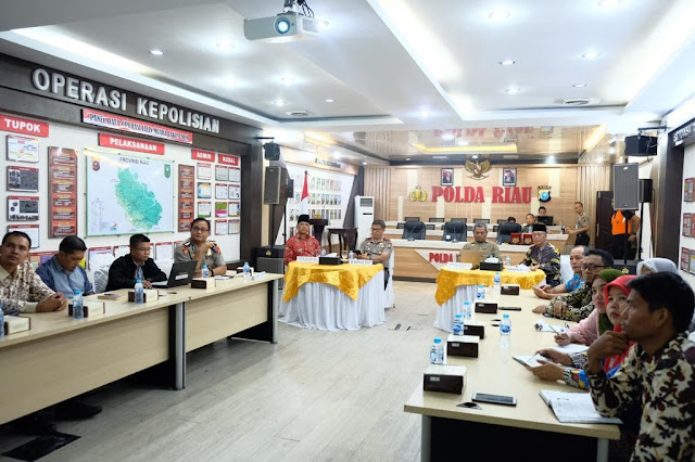 PEKANBARU – Polda Riau membahas prediksi titik api dan kebakaran hutan Riau di ruang Tribarata Polda Riau, Jumat (14/2/2020) pagi.