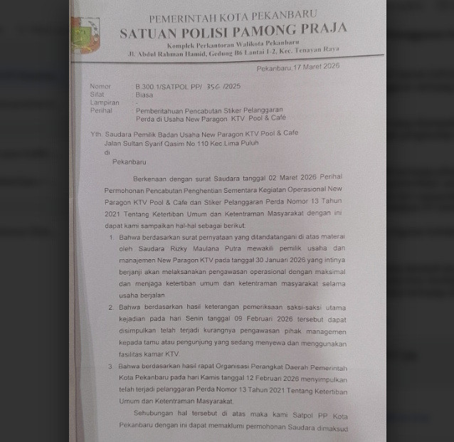 Dalam surat resmi Satpol PP Kota Pekanbaru tertanggal 17 Maret 2026, disebutkan bahwa pihak manajemen melalui perwakilan pemilik usaha, Rizky Maulana Putra, telah menandatangani surat pernyataan bermaterai pada 30 Januari 2026.