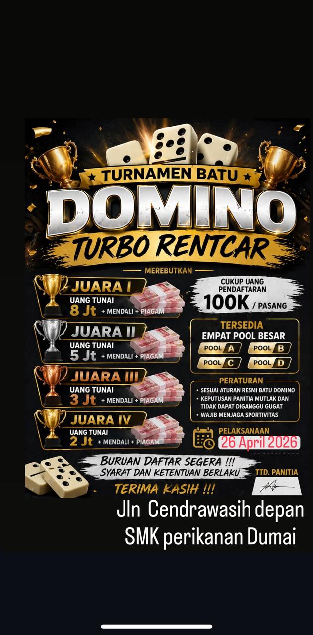 DUMAI – Turnamen domino dengan total hadiah puluhan juta rupiah akan digelar oleh komunitas Turbo RenCar di Kota Dumai. Kegiatan ini dipastikan menjadi salah satu ajang bergengsi bagi para pecinta domino di daerah tersebut.