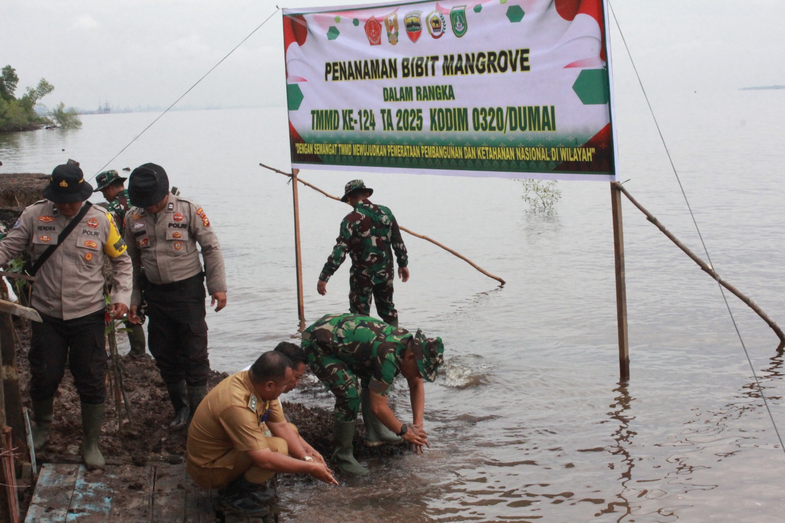 Ratusan bibit pohon mangrove ditanam secara serentak dalam sebuah kegiatan yang merupakan bagian dari rangkaian TNI Manunggal Membangun Desa (TMMD) ke-124 yang diselenggarakan oleh Kodim 0320/Dumai.